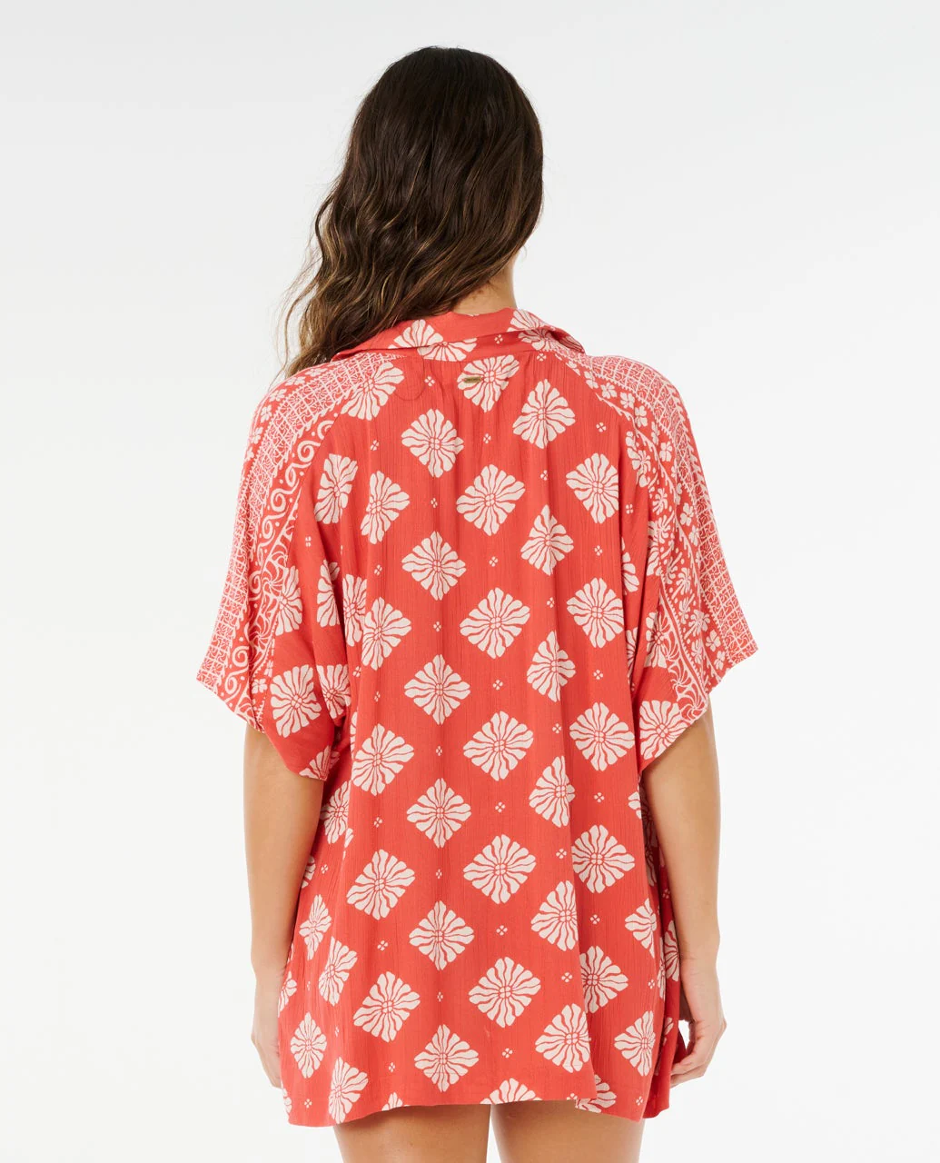 Metal logo trim, Border detail at shoulder seam, All over yardage print, Button through